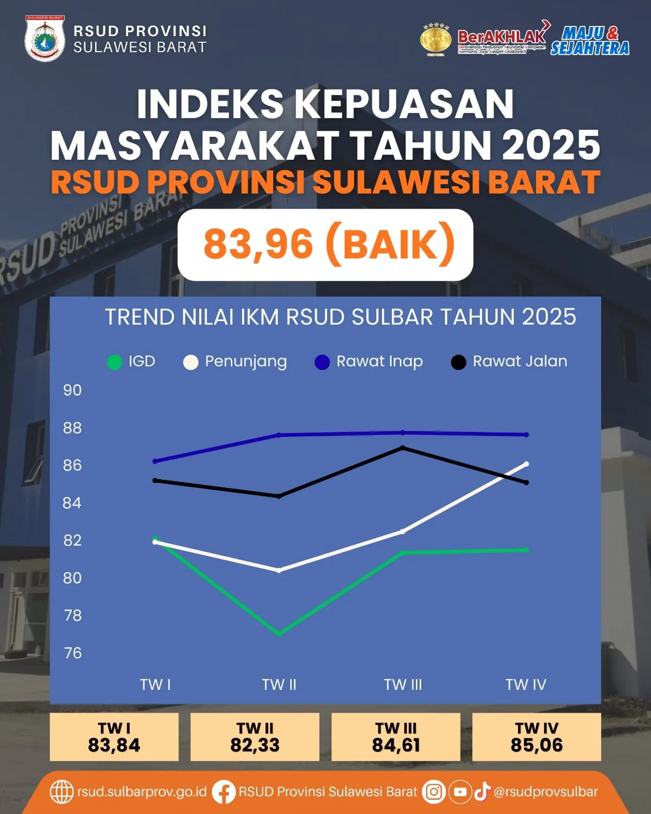 Mamuju – Proclaimnews.id RSUD Provinsi Sulawesi Barat mencatat capaian positif dalam hasil Survei Indeks Kepuasan Masyarakat (IKM) Tahun 2025 dengan nilai rata-rata sebesar 83,96 yang masuk dalam kategori Baik. Hasil ini mencerminkan tingkat kepuasan masyarakat terhadap kualitas pelayanan kesehatan yang diberikan oleh rumah sakit milik Pemerintah Provinsi Sulawesi Barat tersebut sepanjang tahun 2025.