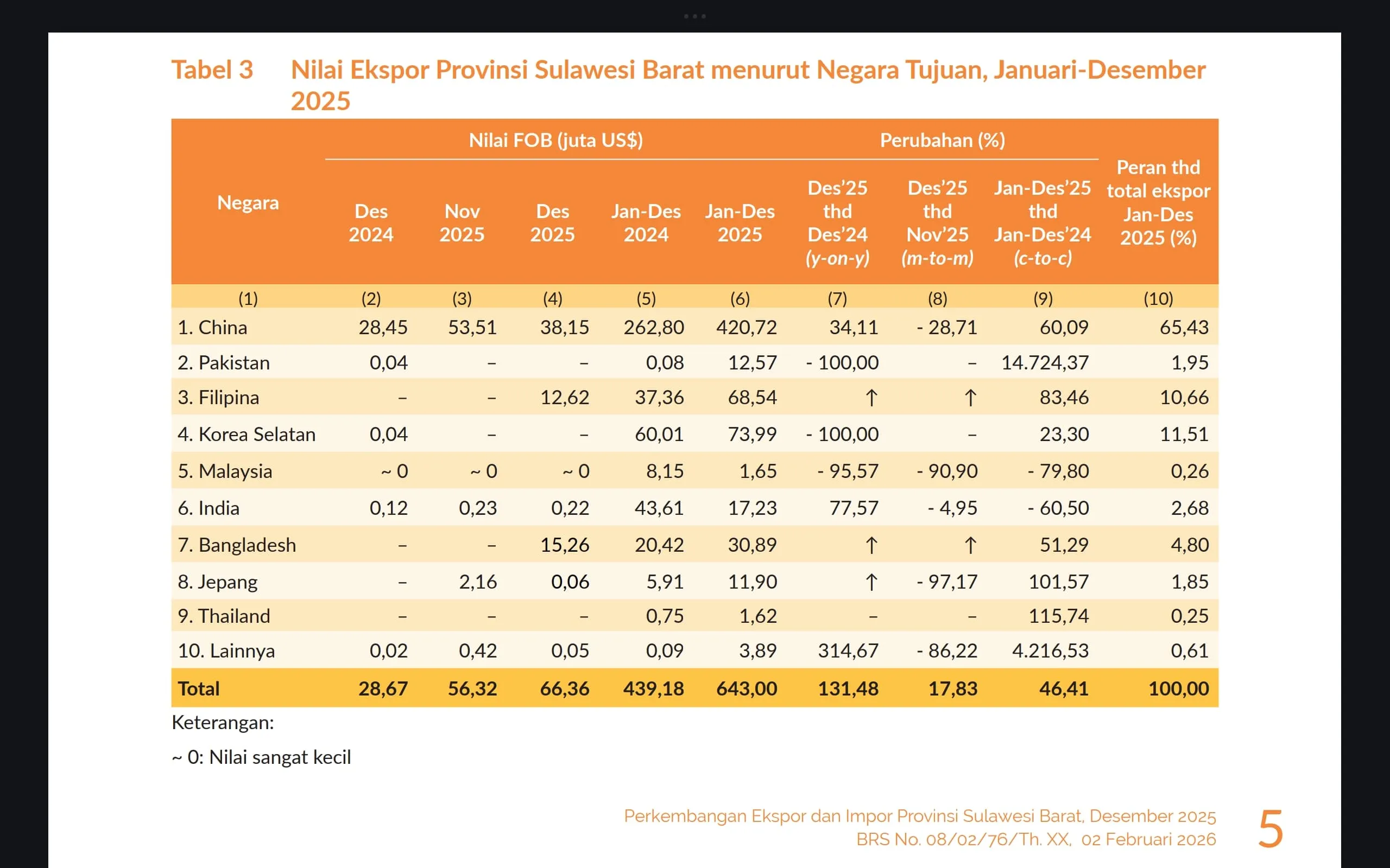 Pada Desember 2025 saja, nilai ekspor Sulbar mencapai US$66,36 juta, meningkat signifikan 131,48 persen dibanding Desember 2024. Hal ini menunjukkan tren pemulihan dan penguatan sektor ekspor daerah yang semakin kompetitif di pasar global.