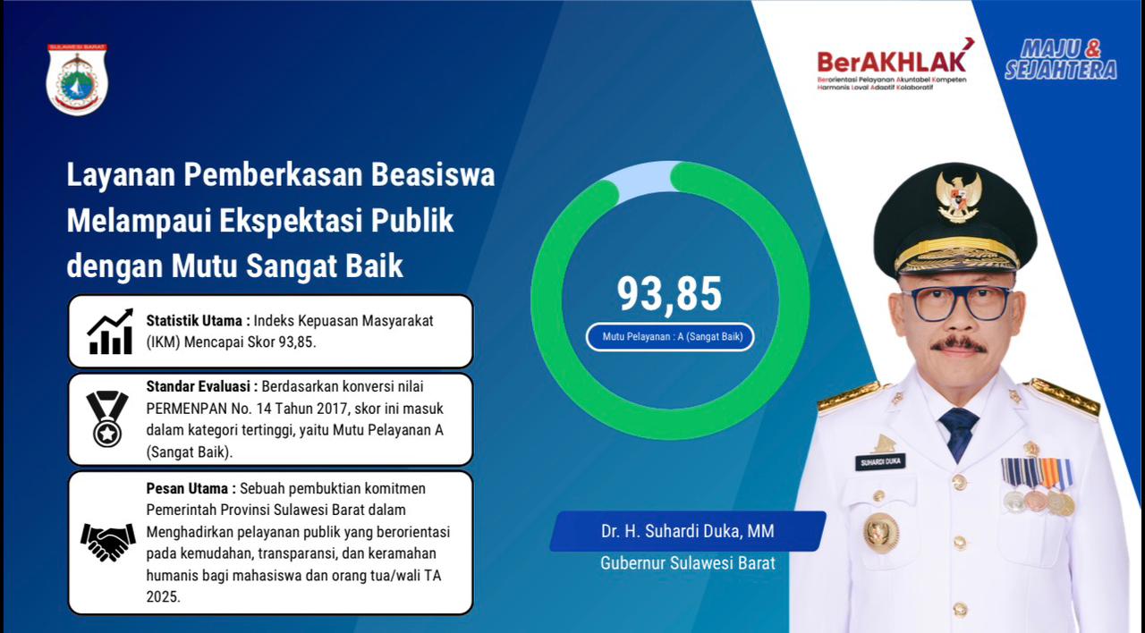 Pencapaian predikat “Sangat Baik” ini berbanding lurus dengan visi besar Gubernur Sulawesi Barat, Suhardi Duka, dalam mewujudkan tata kelola pemerintahan yang “Maju & Sejahtera”. Suhardi Duka secara konsisten terus mendorong implementasi nilai dasar “BerAKHLAK” di seluruh instansi pemerintah untuk menghadirkan pelayanan publik yang berorientasi pada kemudahan, transparansi, serta keramahan yang humanis, terutama bagi para mahasiswa dan orang tua/wali yang menjadi ujung tombak kemajuan pendidikan daerah.